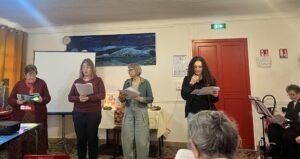 Après avoir visionné un reportage d’actualité présentant le Nigéria (dans une perspective économique, historique et sociale), nous avons commencé la célébration par une prière d’accueil et par quelques paroles de bienvenue lues par des femmes de notre communauté : « Les femmes chrétiennes du Nigéria nous appellent, où que nous soyons dans le monde, à venir trouver du repos« .
